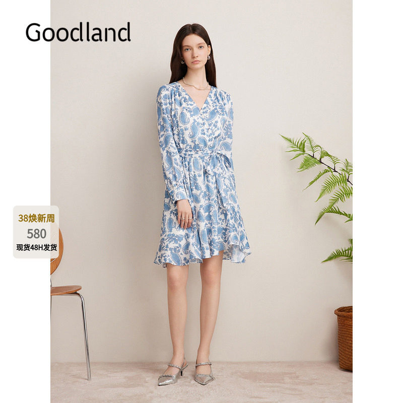 Goodland美地女装春季气质法式印花连衣裙短款v领收腰茶歇裙