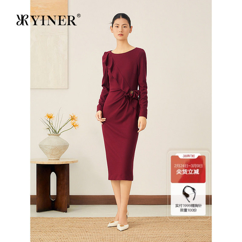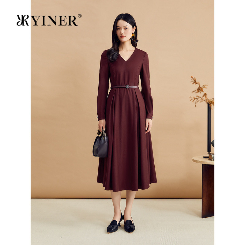 YINER音儿女装冬季时尚法式微醺感安可拉红V领丝光羊毛混纺连衣裙