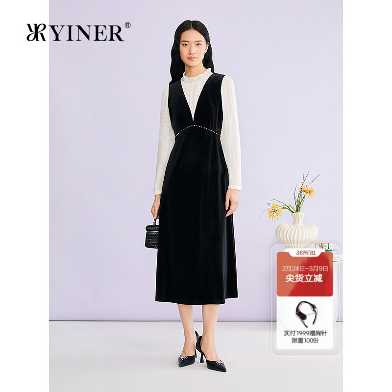 YINER音儿专选2026春季新款优雅钉珠撞色假两件收腰丝绒连衣裙