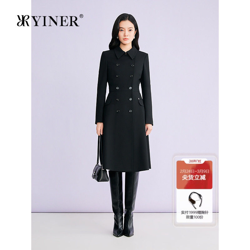 YINER音儿专选2026春季新款时尚赫本风廓形翻领双排扣收腰连衣裙