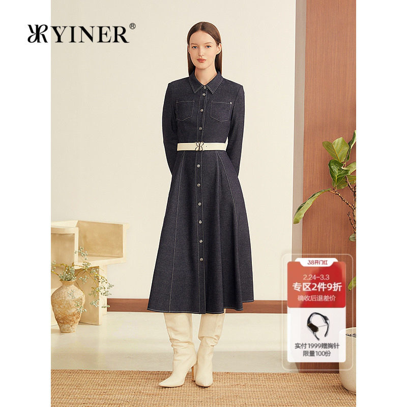 YINER音儿2025冬季新款羊毛混纺仿牛仔肌理翻领金属装饰扣连衣裙