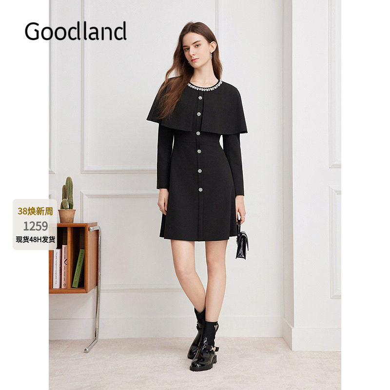 Goodland美地黑色斗篷钉珠长袖连衣裙收腰2026春季新款LC36105350