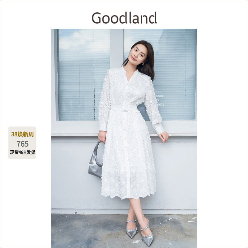 Goodland美地白色镂空蕾丝绣花法式连衣裙收腰仙女裙LC34305260