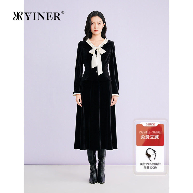 YINER音儿专选2026春季新款优雅蝴蝶结荷叶边V领收腰丝绒连衣裙