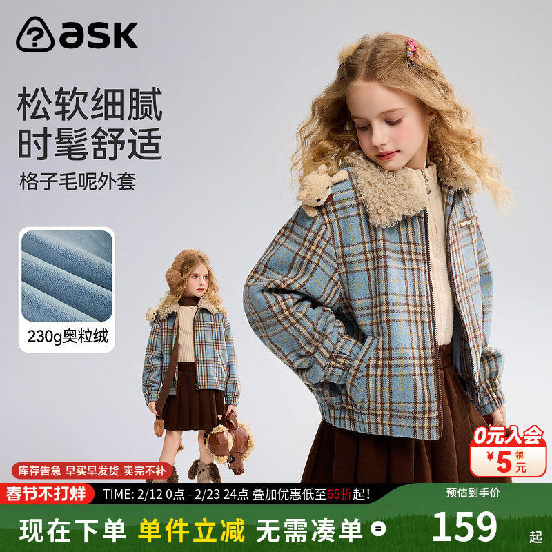 ask儿童外套2026春秋季新款女童格子毛呢上衣中大童甜酷外衣