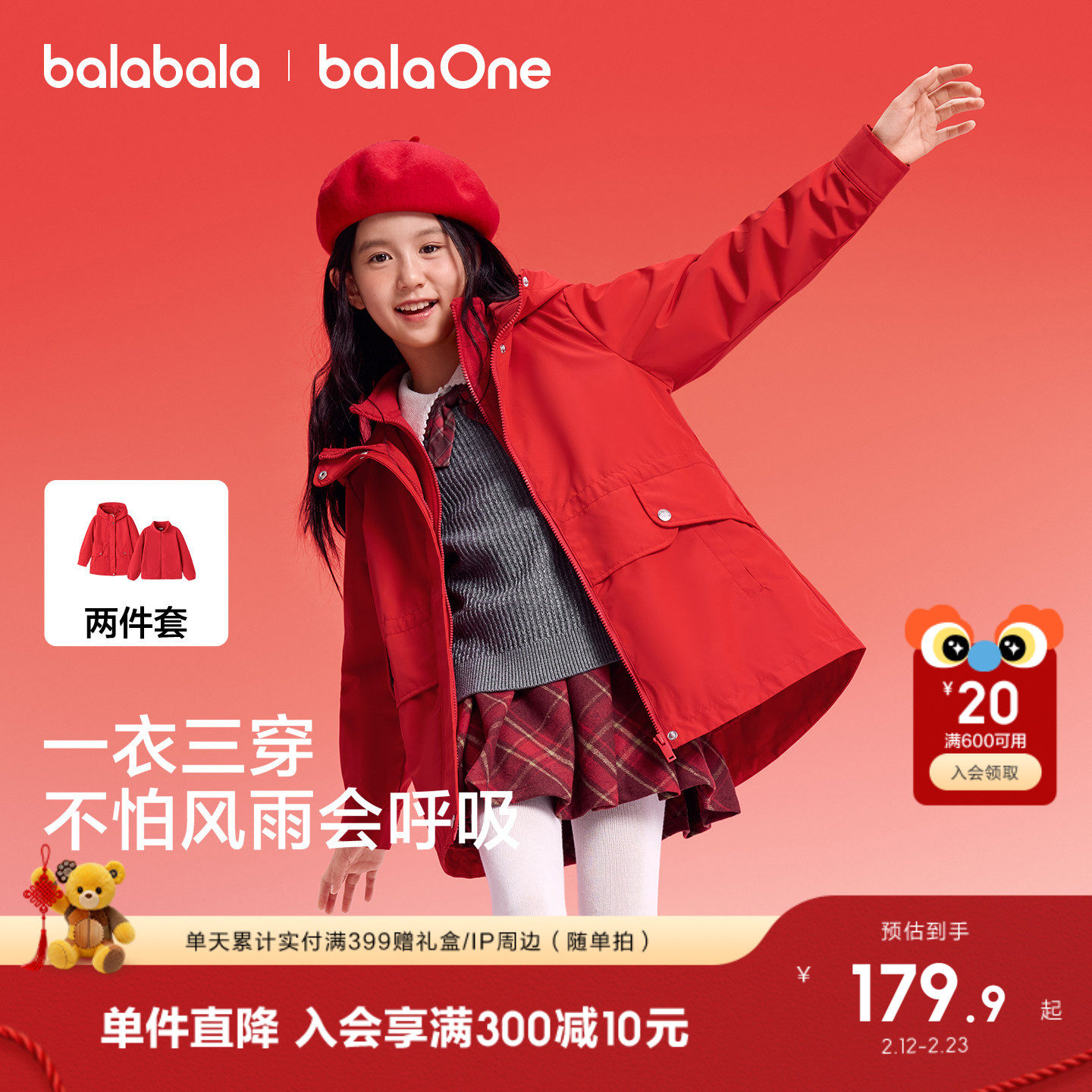 巴拉巴拉童装女童外套儿童上衣2026春秋装防风两件套红色拜年服潮