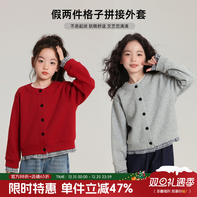 布丁哈鲁童装秋装女童时髦外套2025春秋新款儿童拼接红色格纹开衫