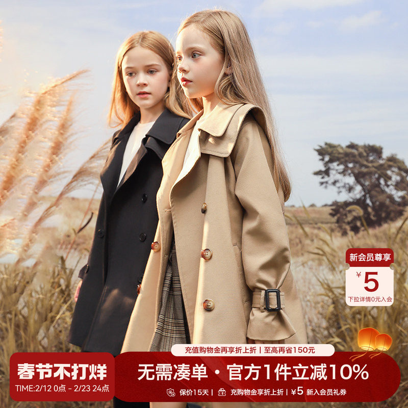 布丁哈鲁秋装女童上衣2026新款儿童春秋休闲复古风衣外套中长款