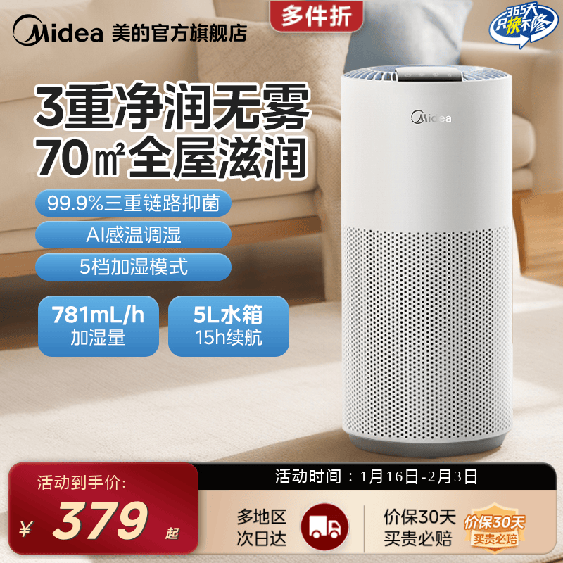 美的无雾抑菌加湿器家用落地大雾量轻音卧室孕妇婴儿客厅智能蒸发