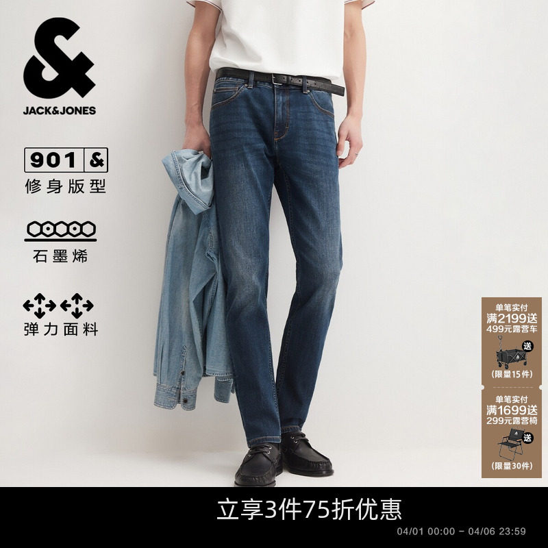 [石墨烯]901杰克琼斯春季修身猫须复古水洗中蓝牛仔裤长裤子男装