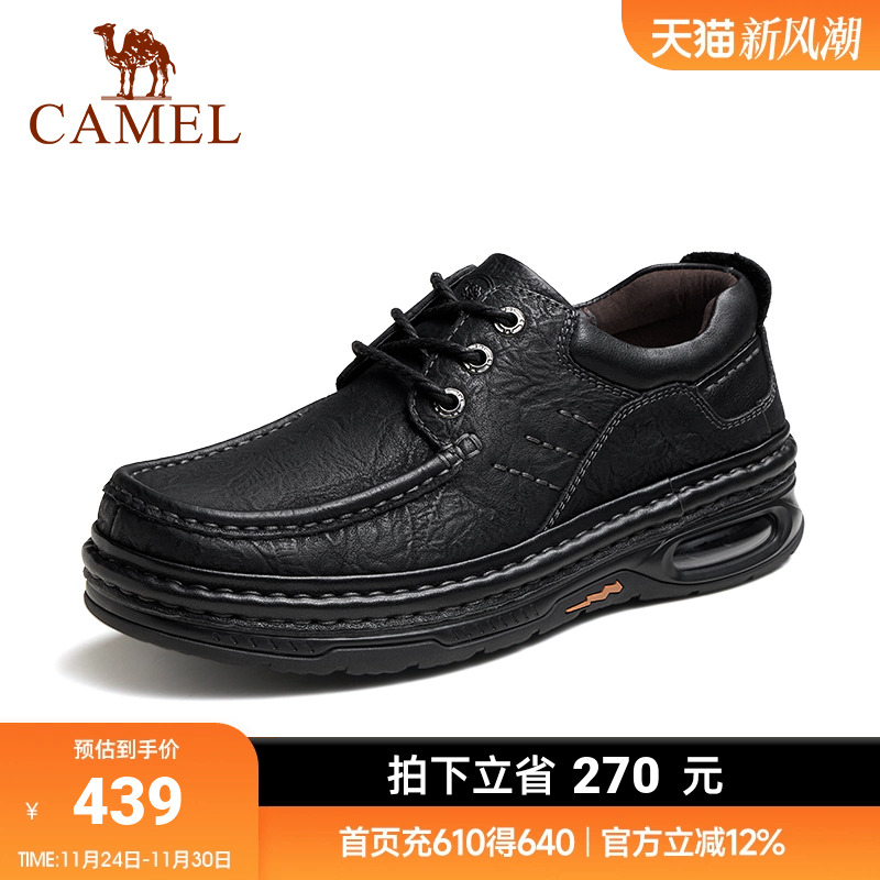 骆驼男鞋秋季商务抓纹牛皮爸爸鞋软底气垫大头鞋厚底休闲皮鞋男士