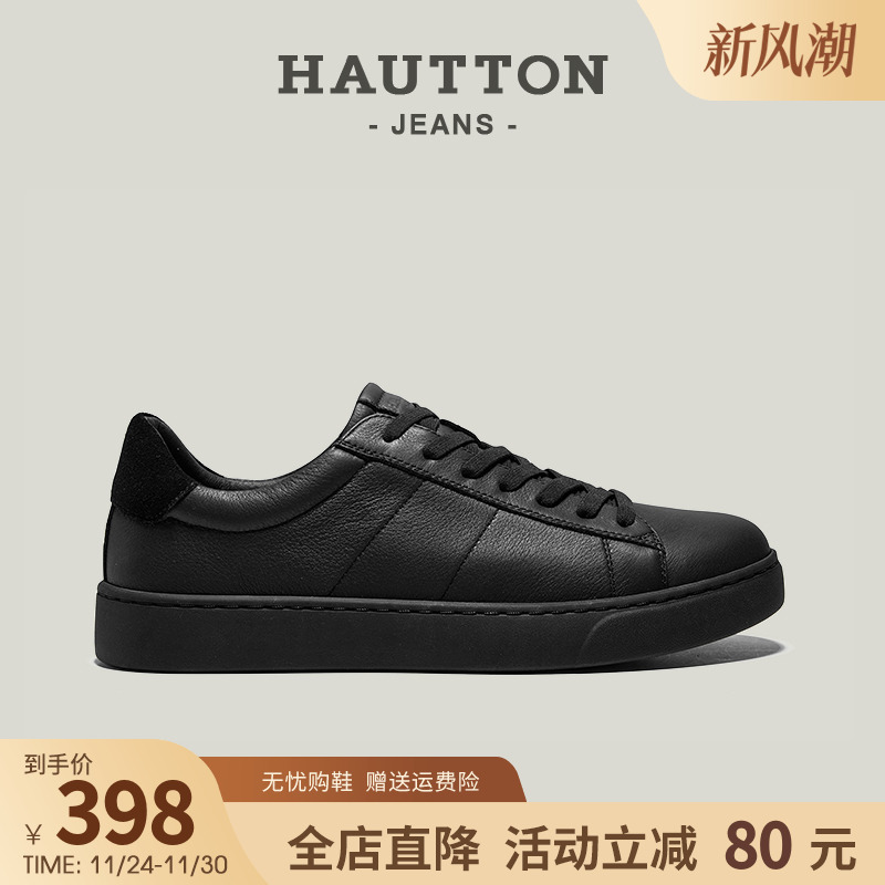 【明星同款】HauttonJeans黑色休闲皮鞋男款百搭板鞋新款真皮男鞋