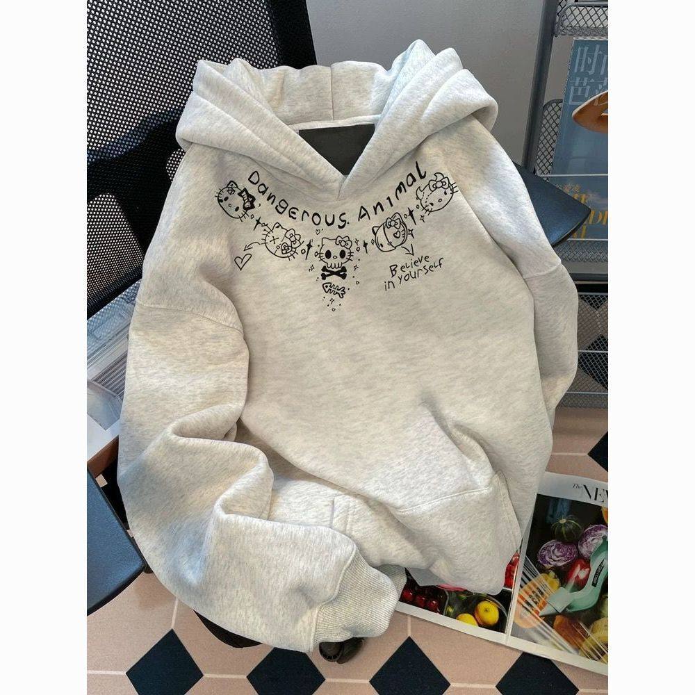 2025美式银狐绒oversize连帽外套Kitty猫白灰色卫衣女生百搭上衣