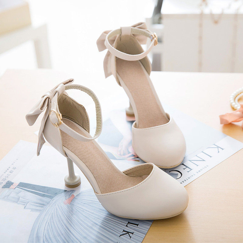 小码3233大码40414243后蝴蝶结细跟罗马鞋浅口扣带包头高跟女凉鞋