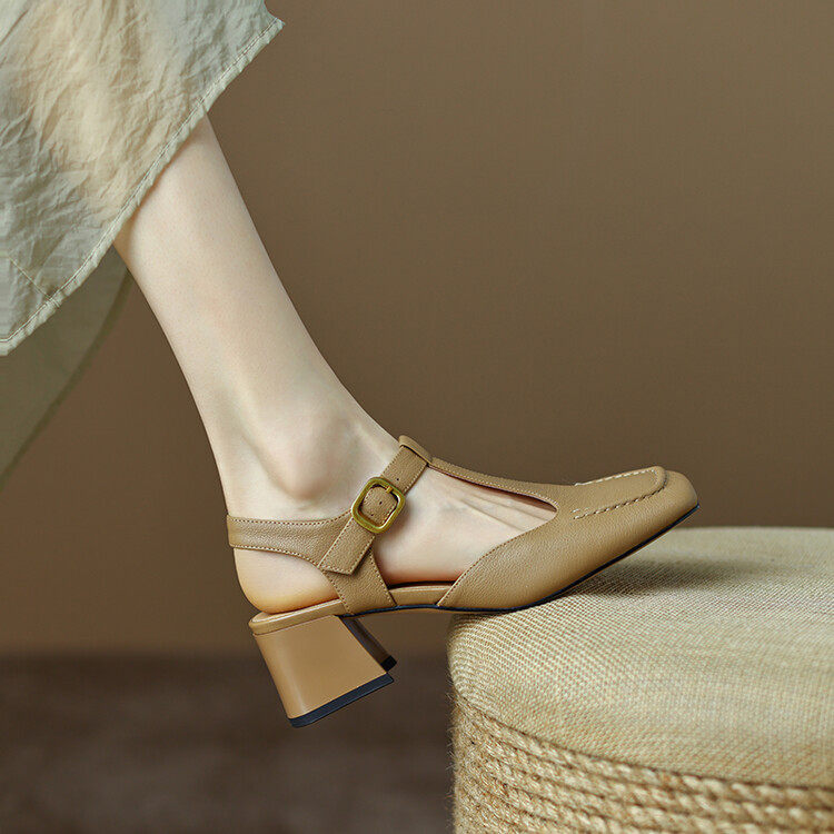 头层牛皮方头复古女鞋春夏新款包头后空一字式扣带粗中高跟女凉鞋