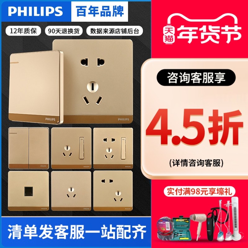飞利浦香槟金86型开关一开五孔插座带usb家用16a空调面板暗装