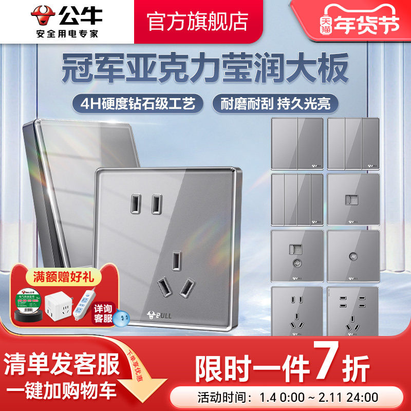 公牛插座官方亚克力面板开关带usb嵌入式五孔插座G62系列钛金灰