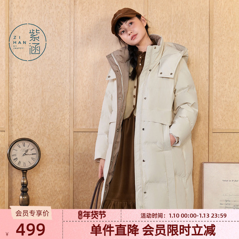 紫涵过膝立领连帽鸭绒羽绒服女冬季新款通勤保暖加厚长款羽绒外套