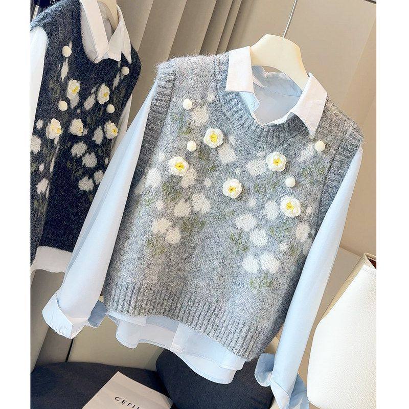 2025早秋新款甜美立体花朵针织衫叠穿马甲背心女长袖衬衫两件套装