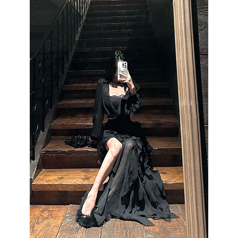 秋季新款纯欲风黑色套装裙女长袖衬衫蕾丝吊带不规则半身裙三件套