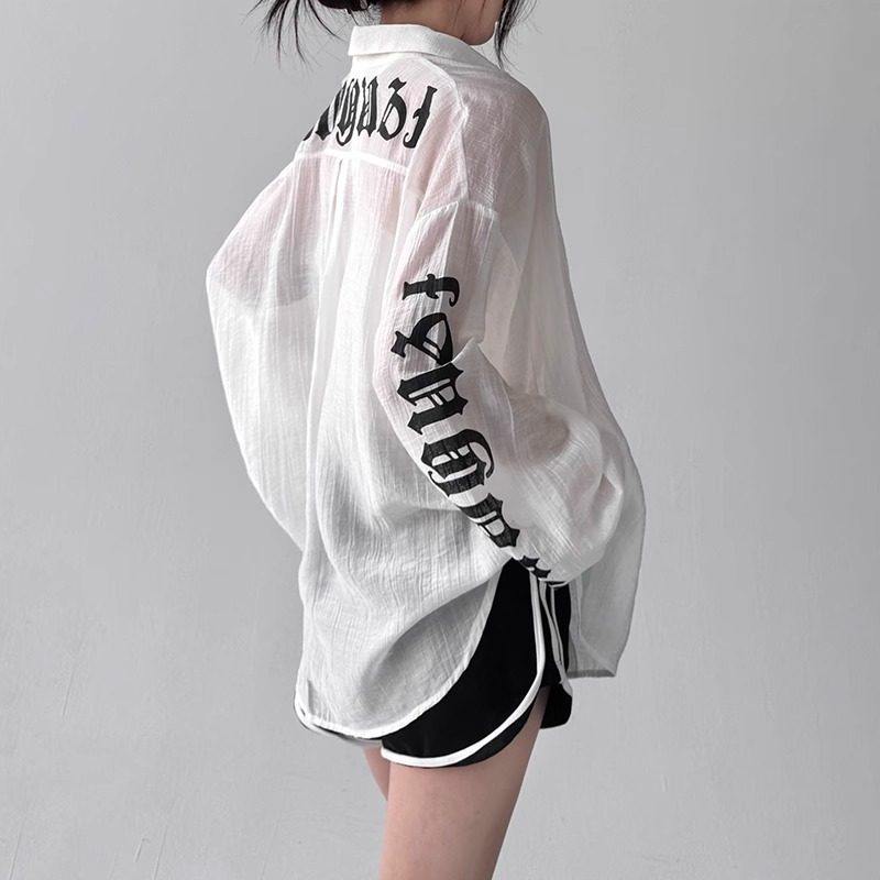 韩舞团中长款防晒衣女长袖衬衫夏季辣妹字母印花单排扣宽松开衫外