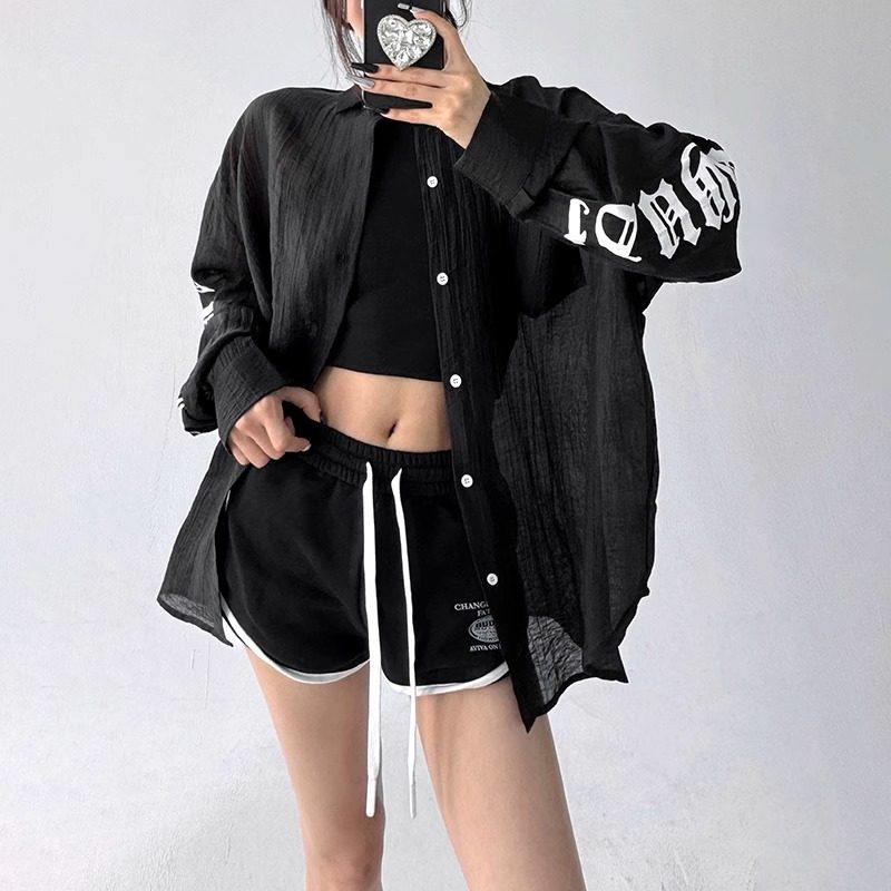 韩舞团中长款防晒衣女长袖衬衫夏季辣妹字母印花单排扣宽松开衫透