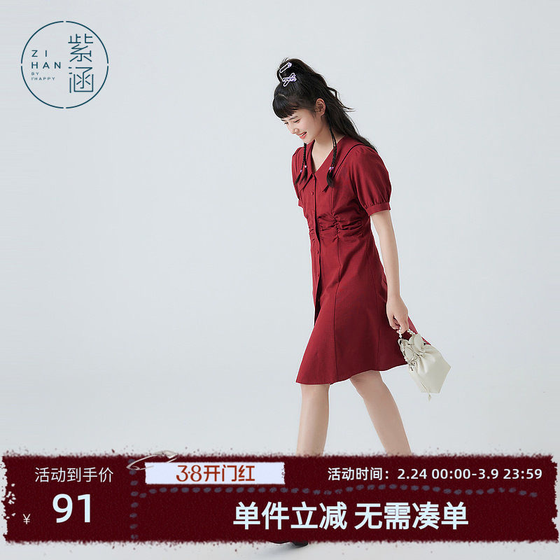 紫涵小翻领简约连衣裙女收腰A字中长裙夏季新款文艺通勤休闲裙子