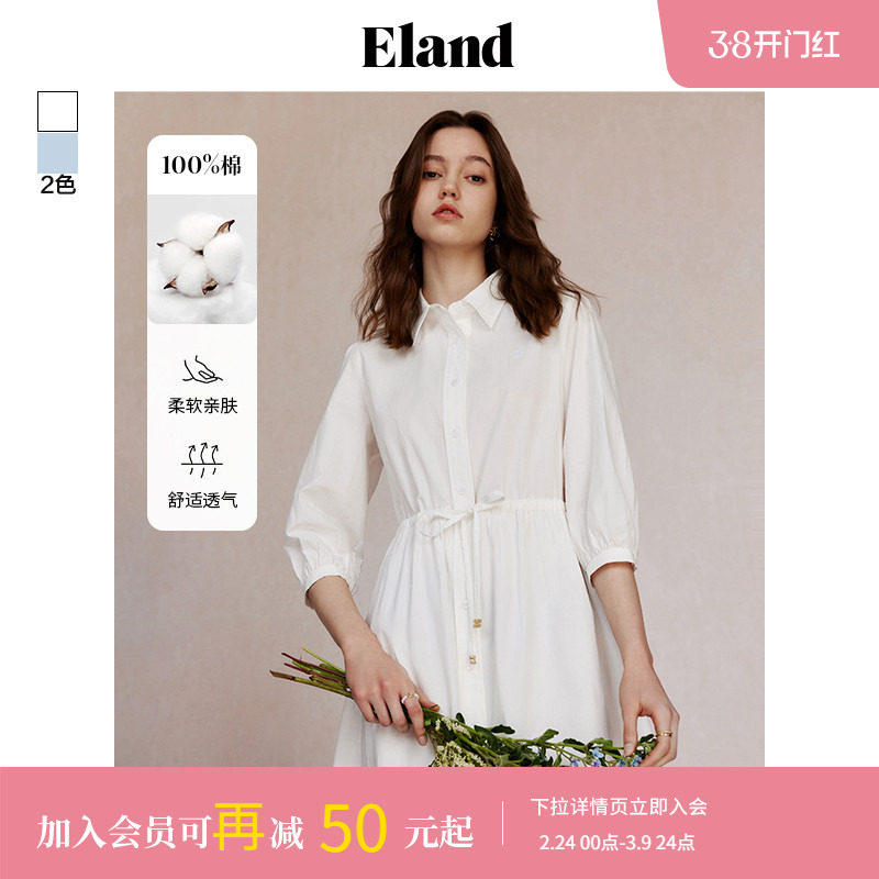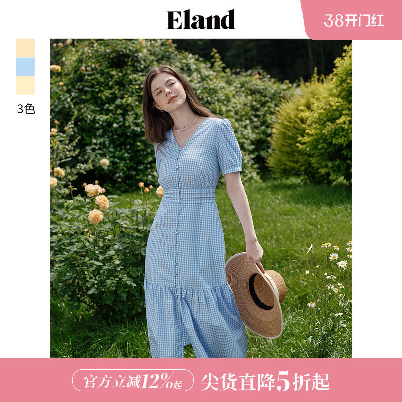 【100%棉】Eland衣恋连衣裙女V领腰部塔克压褶收腰鱼尾薄长裙夏