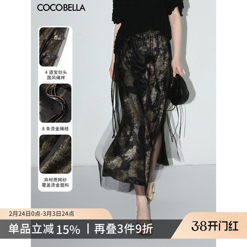 COCOBELLA[浮金碎影]新中式烫金网纱半身裙女春夏开叉长裙HS0028