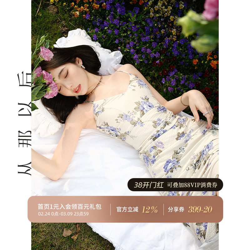 从那以后淡紫水彩碎花吊带连衣裙包身长春花蓝印花开叉长裙夏度假