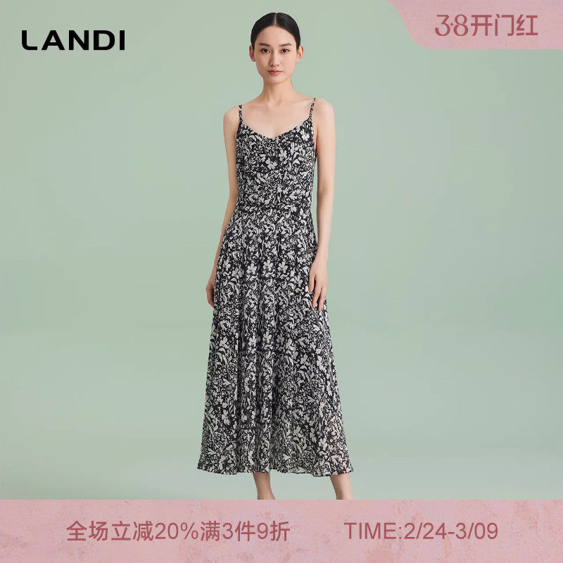 [商场同款]LANDI蓝地法式优雅设计感印花吊带连衣裙女长裙夏新品