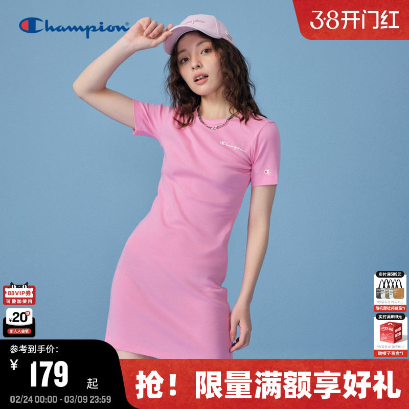 Champion冠军短袖连衣裙女2025夏季新款简约修身粉美式休闲长裙夏