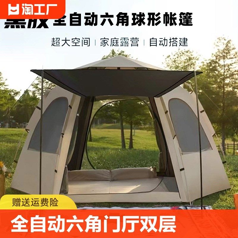 速发全自动六角厅门双层帐篷户叠折外便携式野营黑胶防雨加厚装备