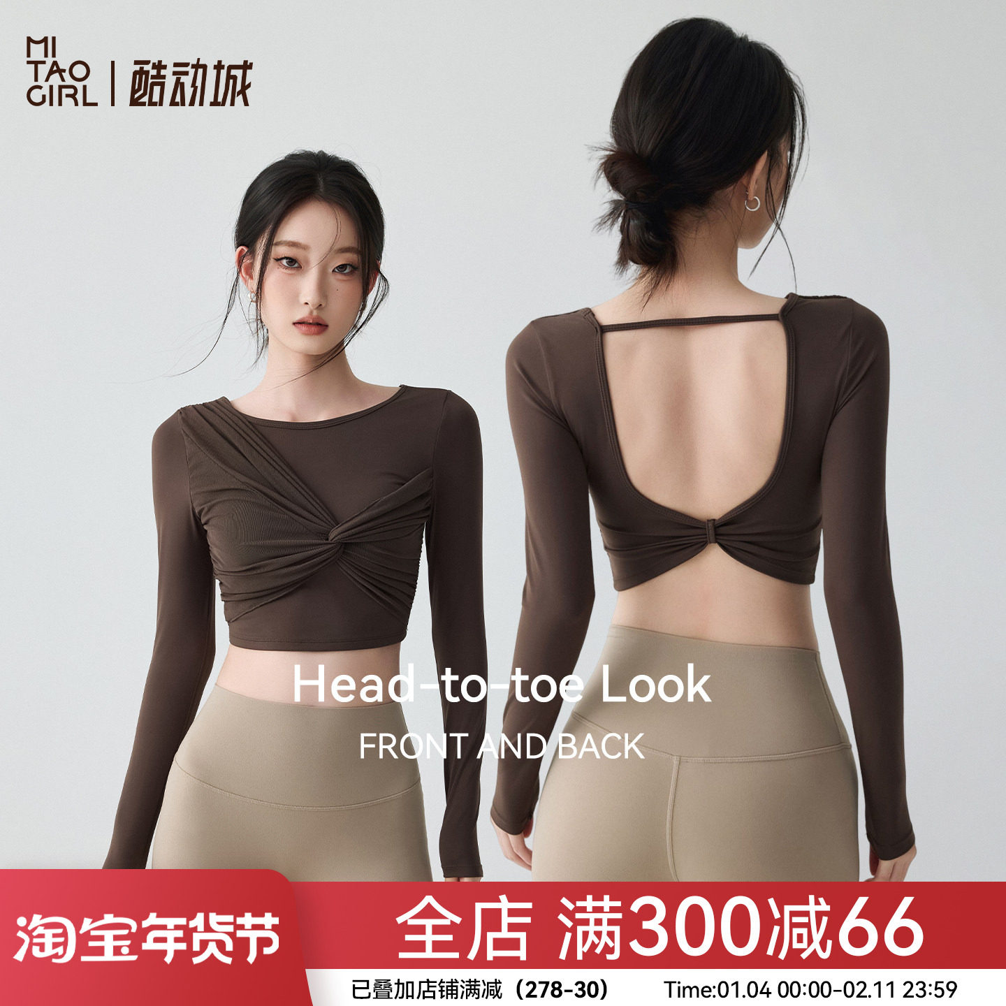 Mitaogirl带胸垫瑜伽服上衣女秋新款网纱扭结运动长袖跑步健身衣