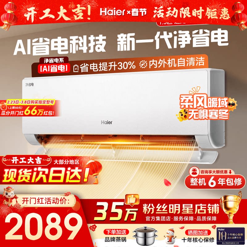 [纯铜管]海尔净省电plus小红花空调新一级能效1.5匹变频冷暖挂机
