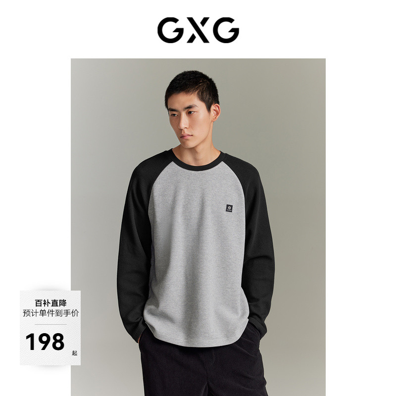 GXG男装 加绒华夫格撞色插肩袖休闲时尚加厚长袖T恤 秋冬热卖