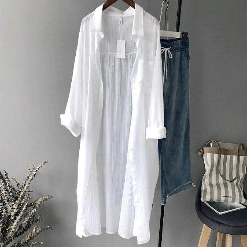 防晒衣女中长款夏季韩版宽松别致长袖薄纱雪纺衬衫白色开衫外套潮
