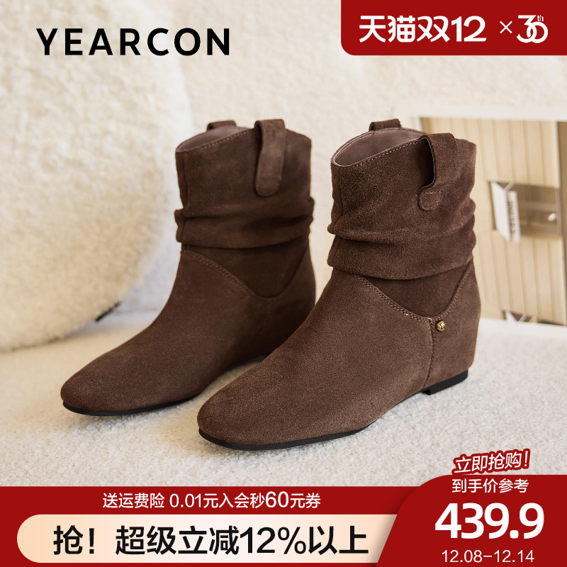 意尔康复古短靴女2025秋冬圆头内增高裸靴美拉德弹力靴坡跟瘦瘦靴