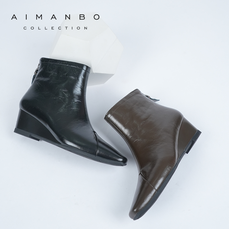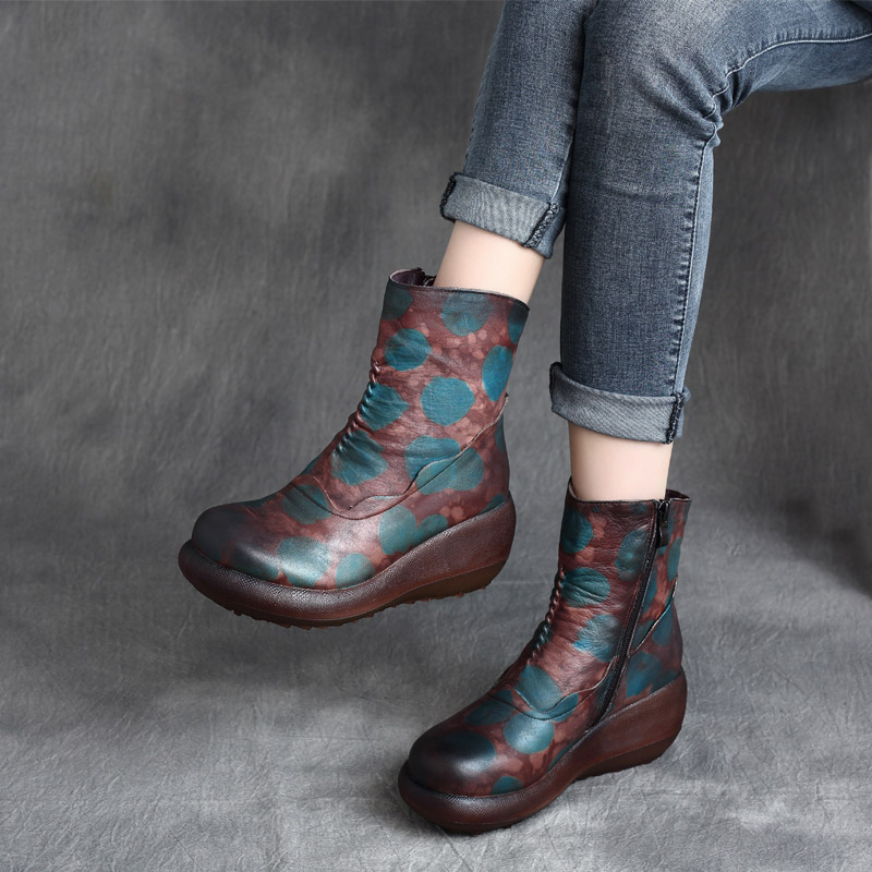 2025秋冬新款复古真皮厚底坡跟防水台拼色侧拉链休闲软底裸靴