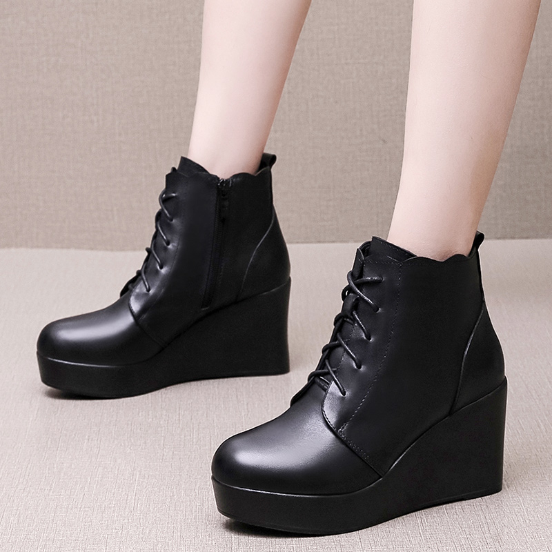 真皮坡跟圆头短靴女冬季高跟防水台厚底裸靴纯色牛皮马丁靴短筒靴