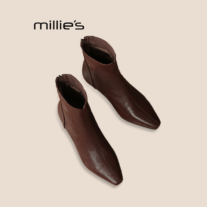 MILLIE'S/妙丽尖头短靴新款秋冬复古裸靴拉链百搭坡跟瘦瘦靴女Z