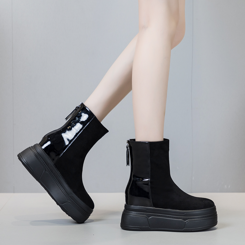 13CM坡跟超高跟短靴内增高中筒靴防水台松糕厚底保暖马丁靴裸靴女