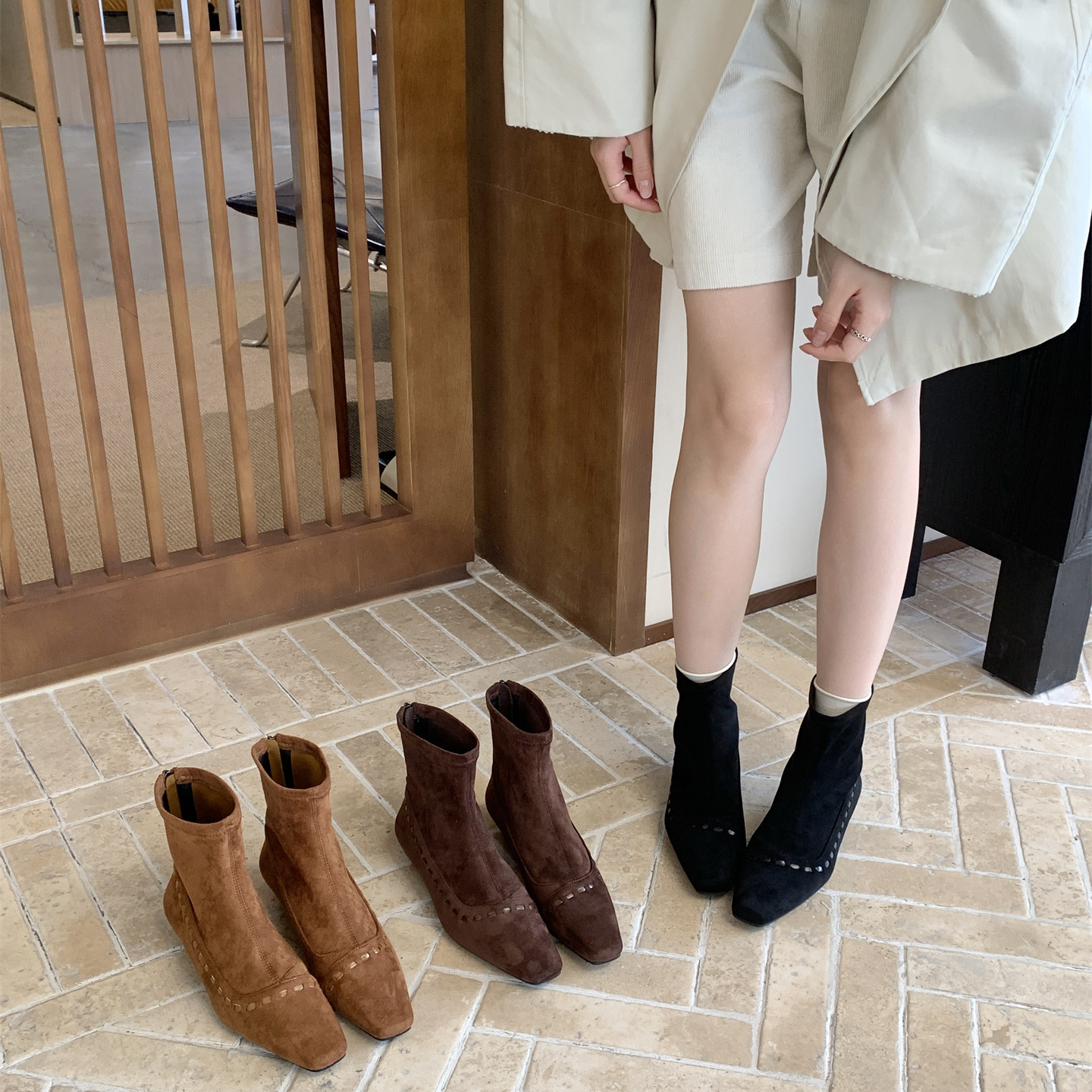 软到爆!方头绒面拼接小短靴女2025秋冬小坡跟后拉链瘦瘦靴裸靴
