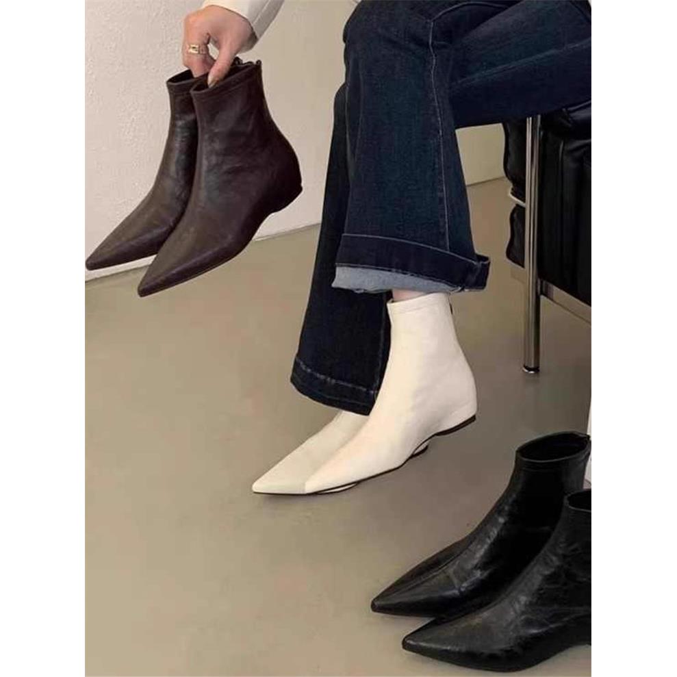 品牌断码真皮短靴女2025秋冬新款软底低跟裸靴坡跟尖头马丁靴单靴