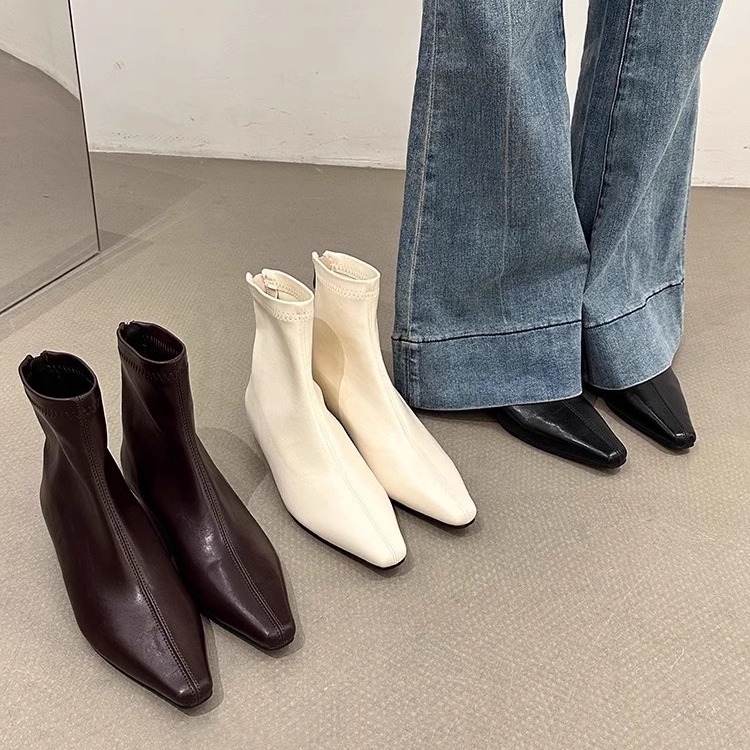 香港2025年法式尖头小裸靴坡跟瘦瘦靴女内增高后拉炼短靴女马丁靴