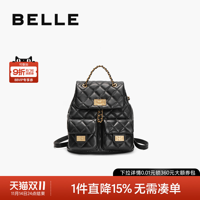 百丽女包质感真皮小香风上班通勤背包羊皮黑色链条双肩包X9330BX4