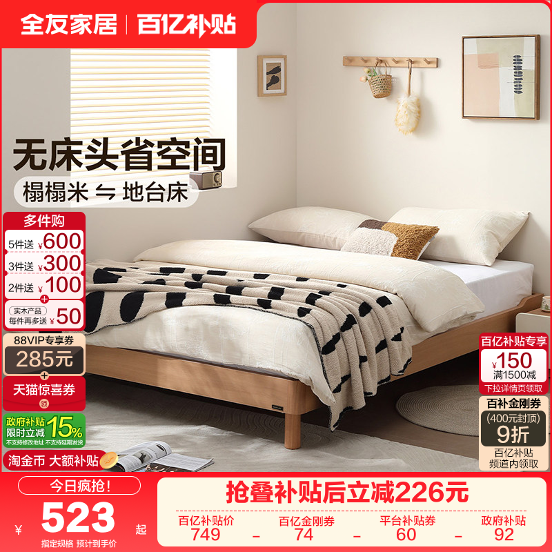 全友家居原木风无床头床榻榻米卧室地台床架新款实木脚家具单人床