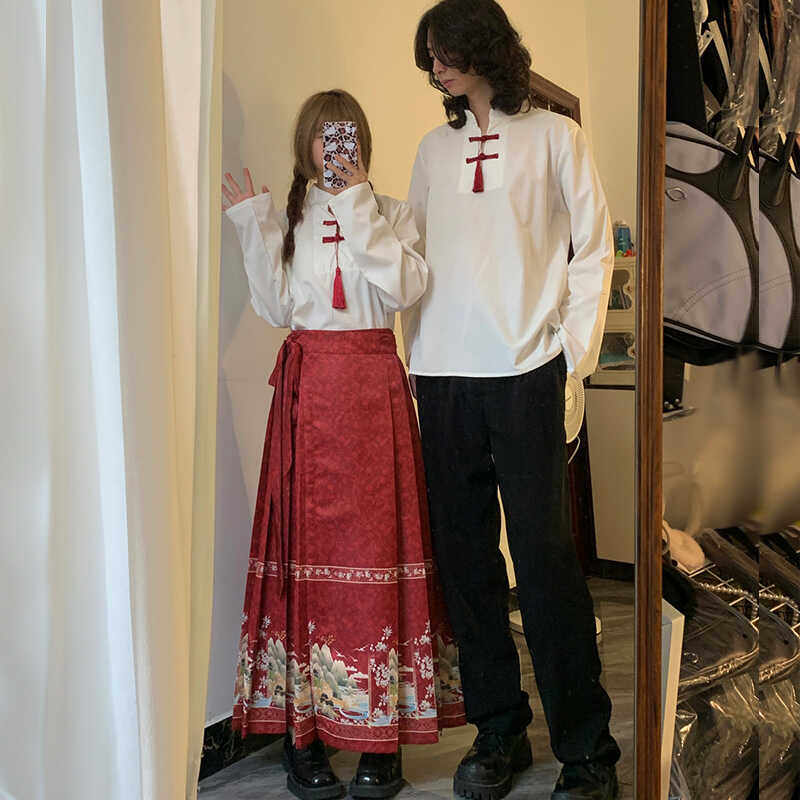 中国风短袖唐装改良汉服马面裙红色套装新中式情侣学生班服演出服