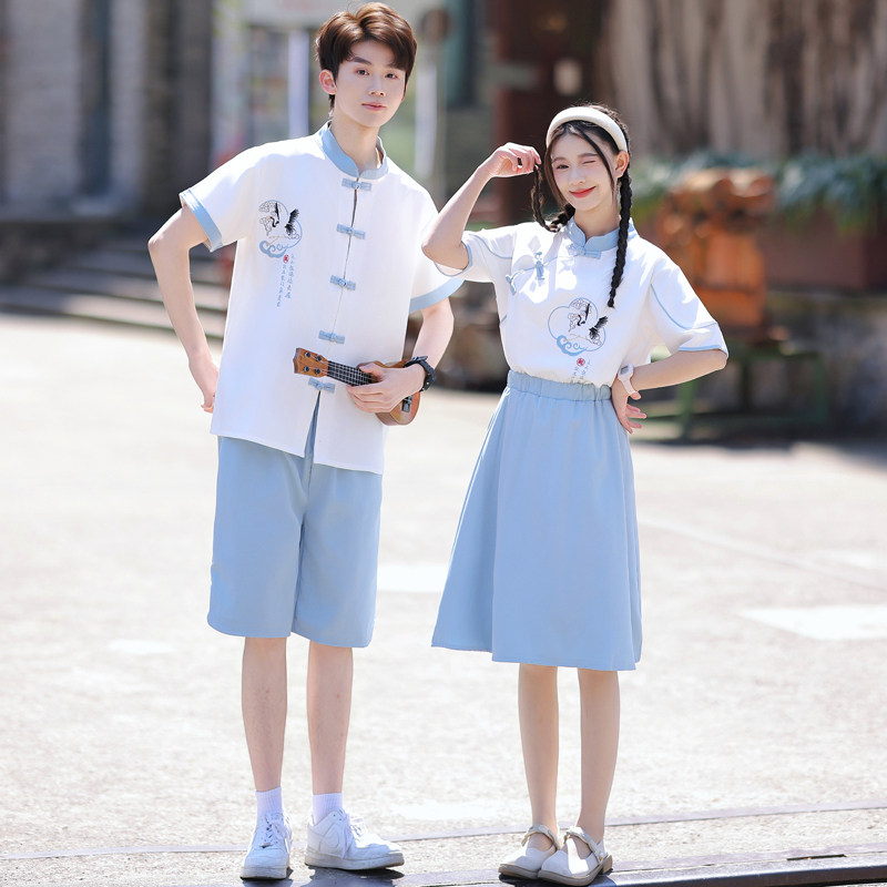 情侣装夏季新中式套装花色旗袍女短袖半身裙男套装盘扣学生班服潮