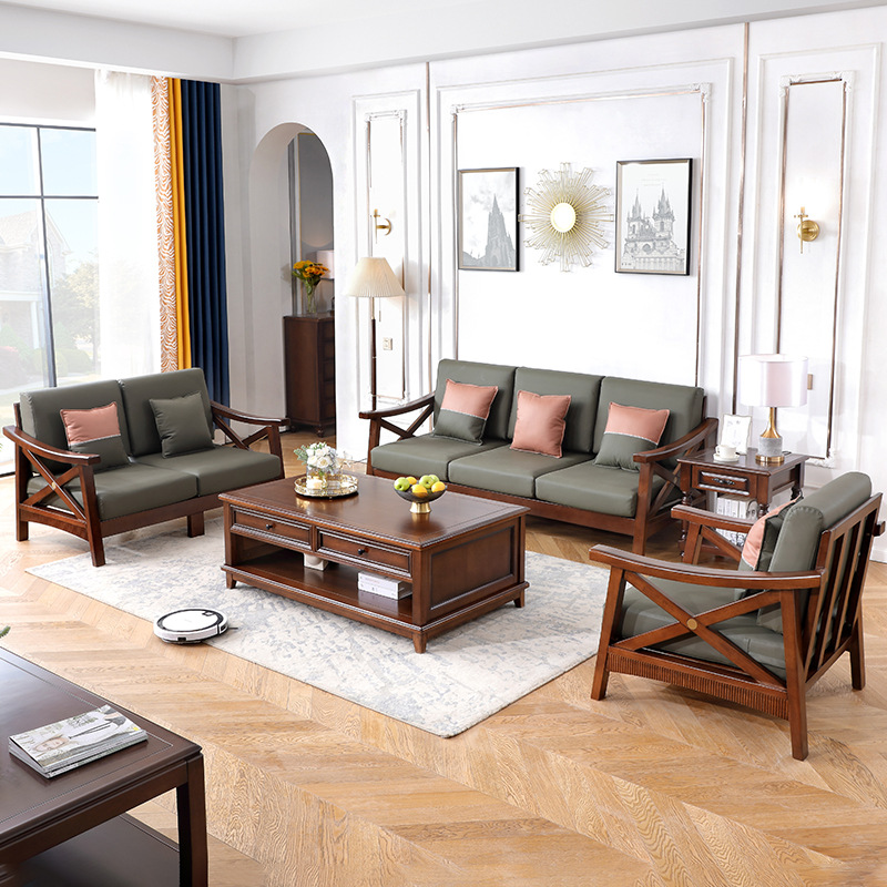 美式乡村实木沙发组合简约休闲客厅三人位真牛皮时尚经典家具整装